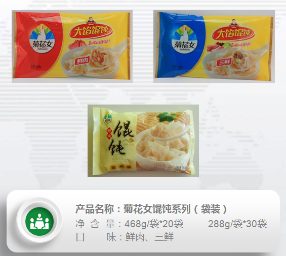 “菊花女”海鮮餃子、餛飩由品牌創始人王艷紅女士歷經十余年潛心研制,以鮮活海鮮為主料,配以各種無公害蔬菜及20余種原料秘制而成,口感鮮美、營養豐富。產品曾榮獲“中國名宴”、“金廚獎”、“東北名點”、“遼寧家常名點”等榮譽稱號。2011年,公司被葫蘆島市質量監督局授予“葫蘆島名牌產品”,2012年被授予“遼寧省著名商標”、市級農業產業化重點龍頭企業。